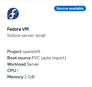 - In the Openshift web-console, let's create two VMS. Both of these based on the Fedora.