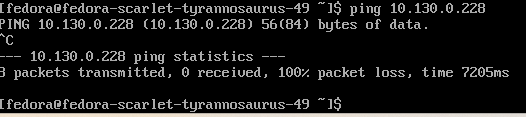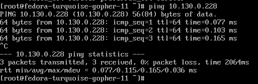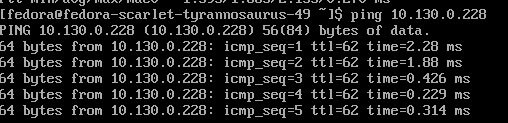 - From the first VM that was created (fedora-turquoise-gopher-11), try pinging the 10.130.0.228 IP which is associated with the other VM (fedora-maroon-wombat-61).