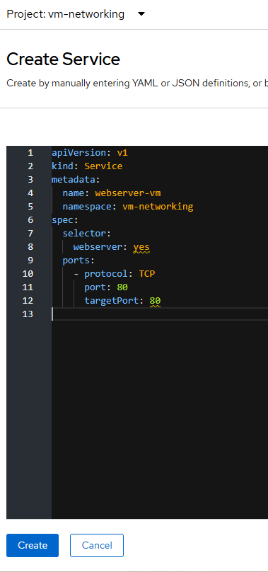 The name here (webserver-vm) gives the service a name so one doesn't have to remember individual IP addresses. This name will be used later as a short-name when in the same namespace and as an FQDN name when used from the same cluster but in a different namespace.
