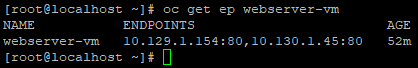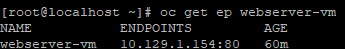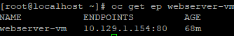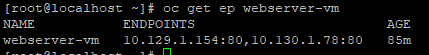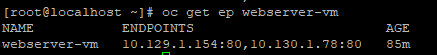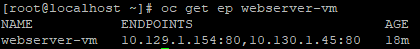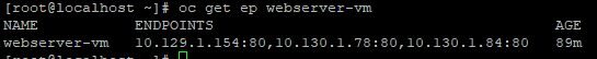 oc get ep webserver-vmRight now, there are two endpoints corresponding to the two VMs. You will see the pod IPs and port 80 (webserver).