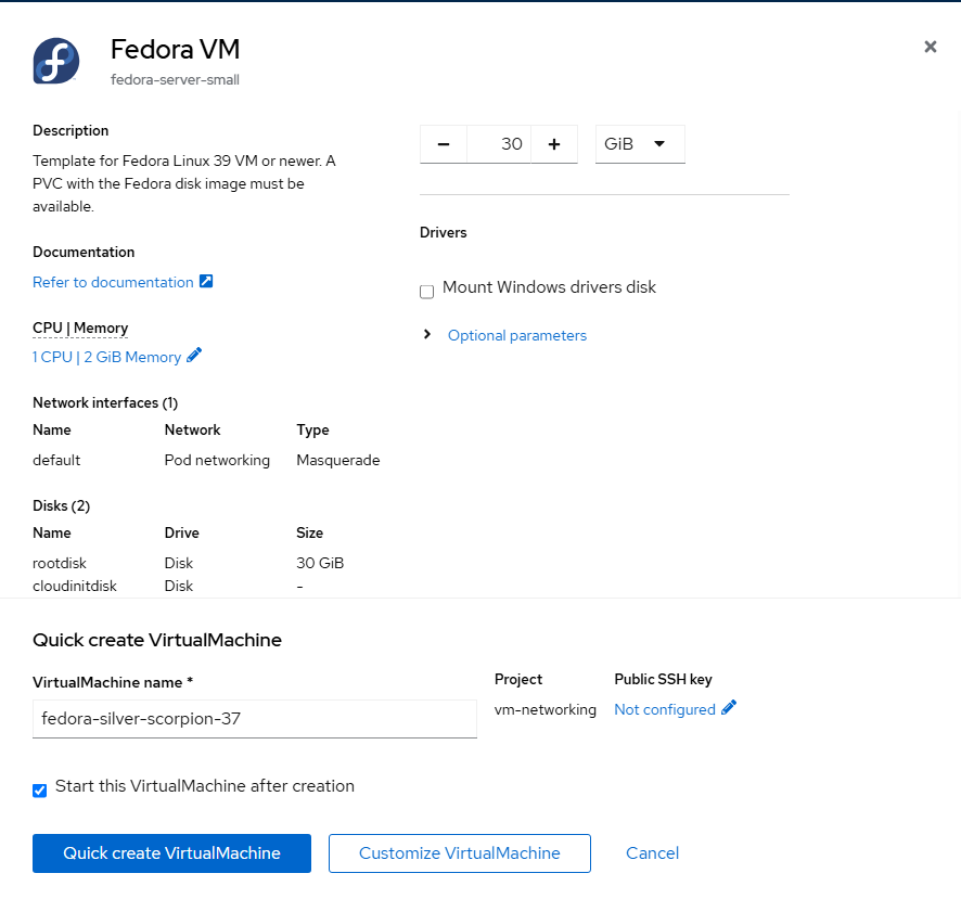- Use Fedora template as we did earlier but click "Quick create VirtualMachine".