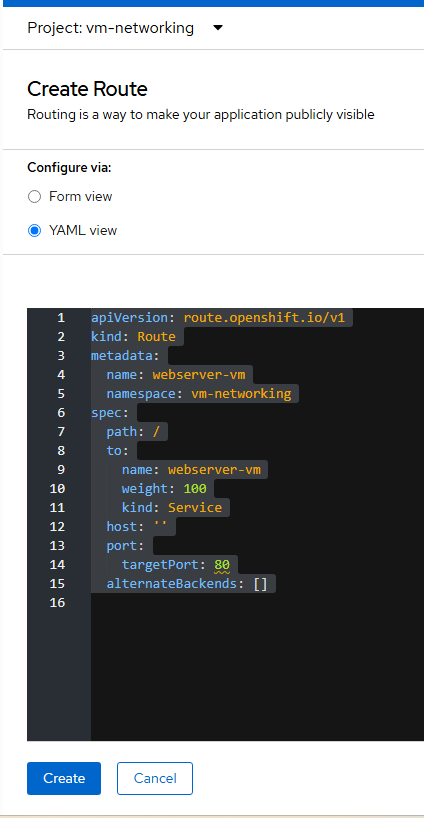 In this example, I will just do something simple and attach the route to the existing "webserver-vm" service as shown below.