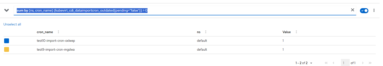 The query that is being run for this alert is "sum by (ns, cron_name) (kubevirt_cdi_dataimportcron_outdated{pending="false"}) > 0" meaning that it will display any boot volume imports for virtual machines that are outdated.