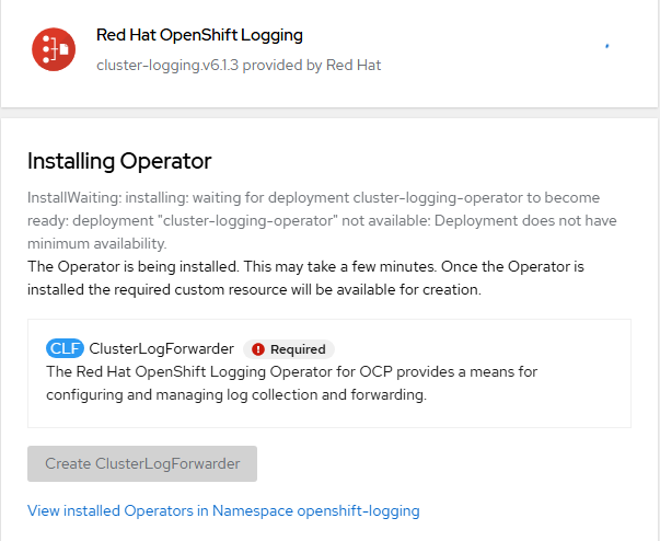 "Create ClusterLogForwarder" option will light-up when the install is finished. Let's not configure anything additional for this at the moment.
