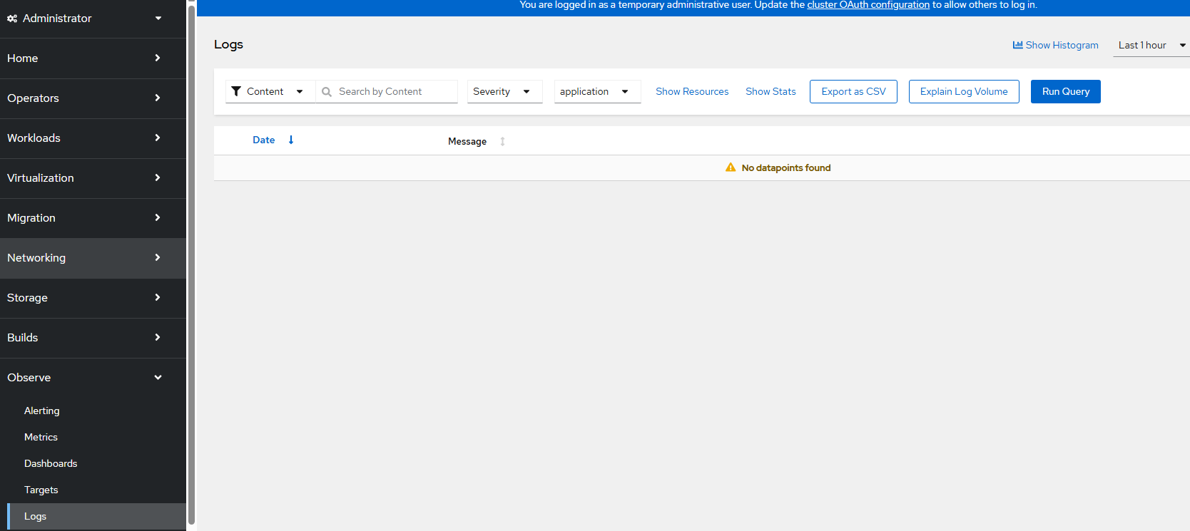 - Wait a few more minutes and the Observe --> Logs view will show new logs coming in.