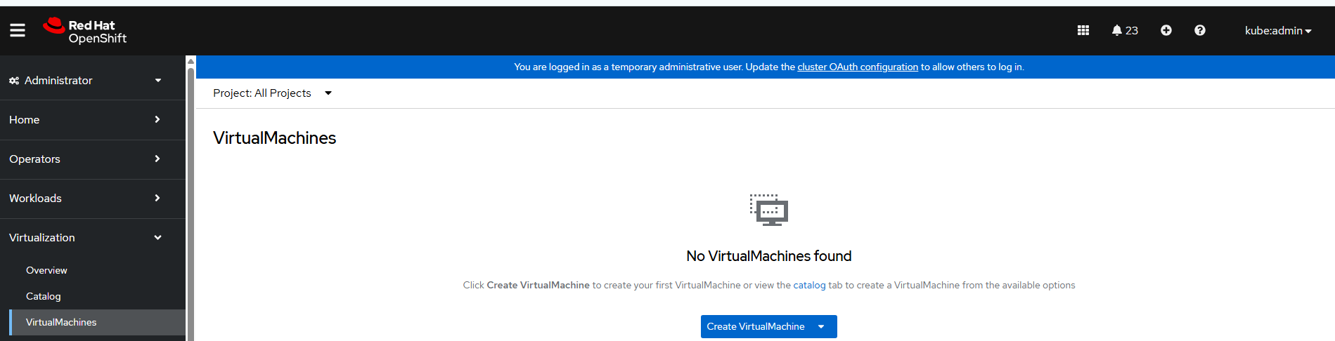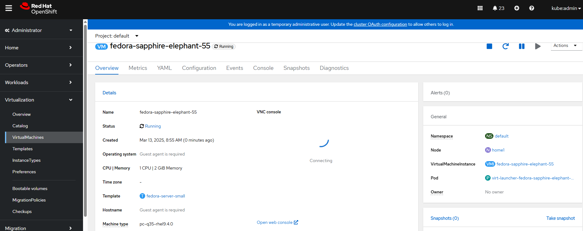 In the Openshift web console, under the Virtualization --> Virtual Machine views you will see any VMs that are currently running.