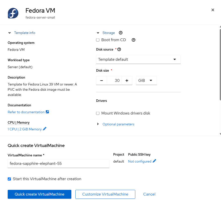 - On the resulting screen, choose the defaults which will be 1VCPU and 2GB of memory and click "Quick create VirtualMachine".