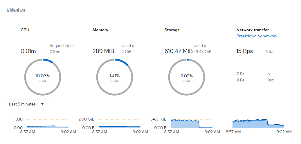 Within a few minutes, there will be some metrics that show for this VM. To view the current utilization (cpu/memory), go to Virtualization --> Virtual Machines and click on the virtual machine that was just created.