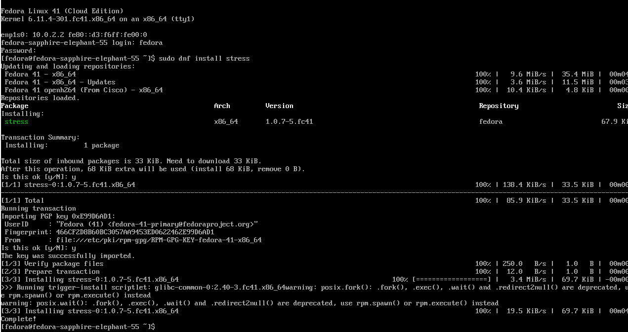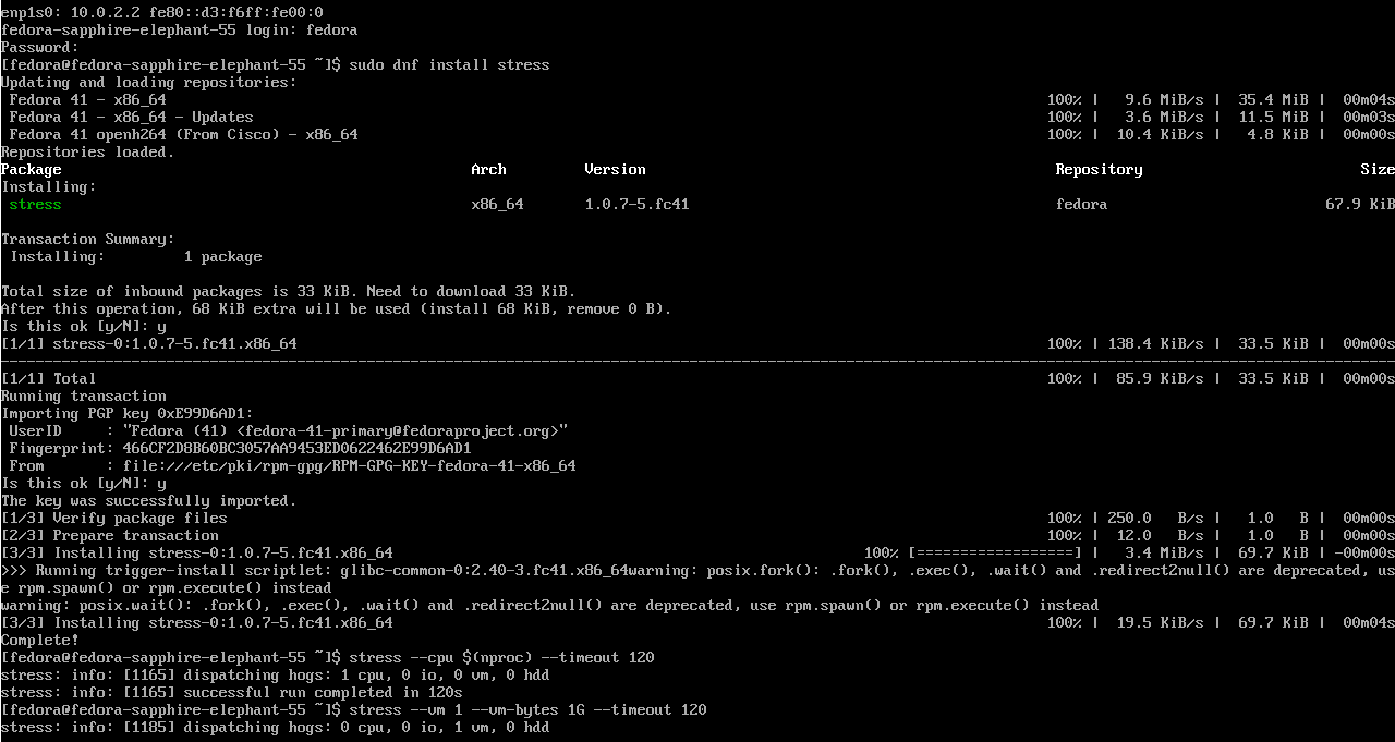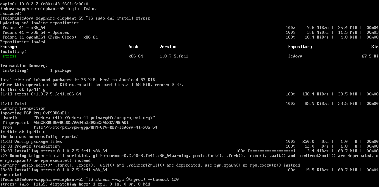 In the Fedora VM that was created before, let's install some utilities that will stress test this system to verify the accuracy of these metrics.