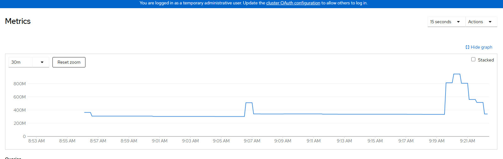 stress --cpu $(nproc) --timeout 120This will run the maximum CPUs (1 in our case) for 2 minutes which is enough to show in the metrics graphs.