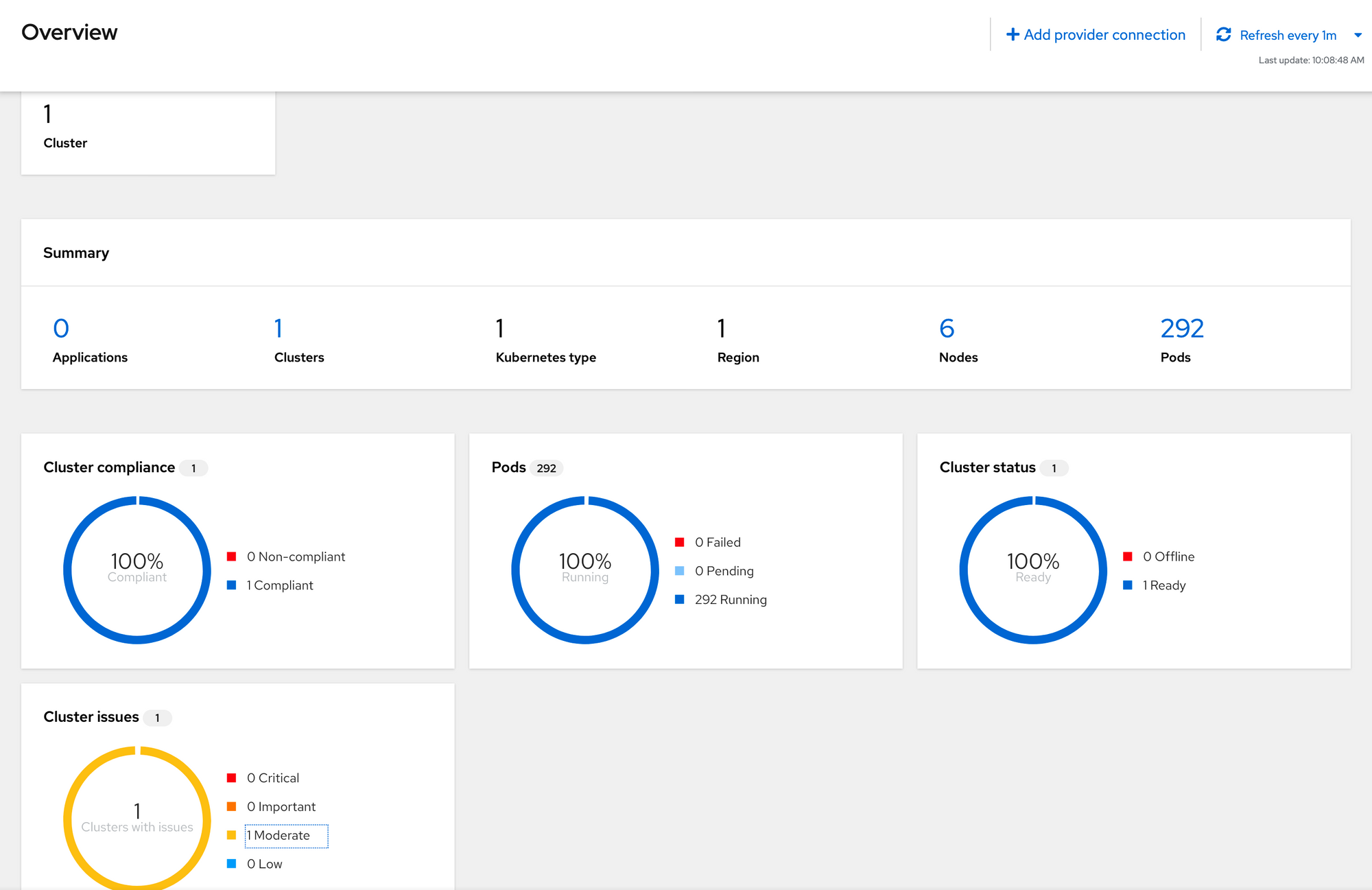 Overview: This will show a high-level status of any clusters that are currently managed by ACM. In the screenshot below, only the hub cluster is being managed (self-managed).