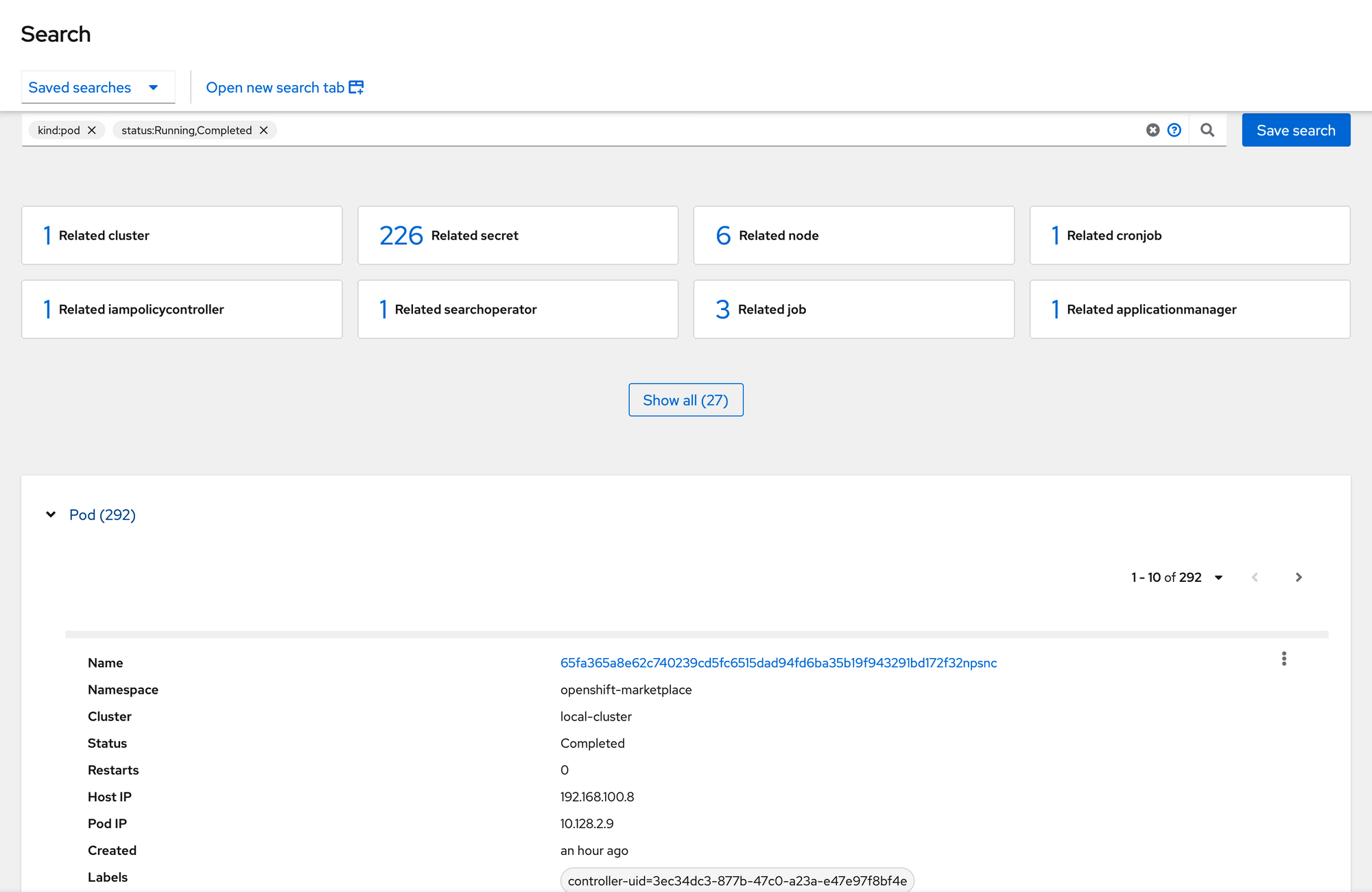 The resulting screen appears as follows. Notice the search criteria at the top. In the middle of this screen is a list of common objects (each clickable). Since we already searched for pods in the local-cluster that are running or completed, this is what appears at the bottom. At the bottom of the screen is the first pod in the output with some high-level information provided such as Name, Namespace, Cluster, Status, etc.