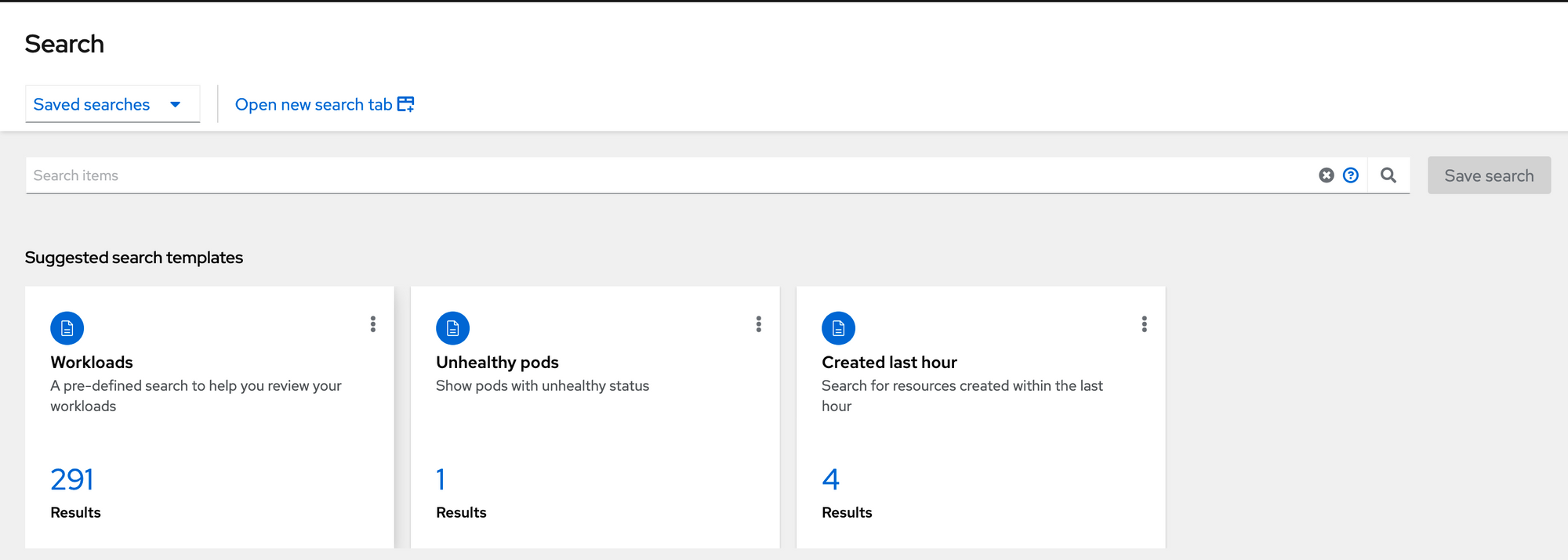For example, if you look at the pods section, there are 293 pods running. If we click on the 293 pods, the search terminal (another section on the search terminal will be shown later in the post) is brought-up with the search criteria already populated as "kind:pod,status:Running OR Completed. This is in the context of the local (self-managed cluster) at this point.