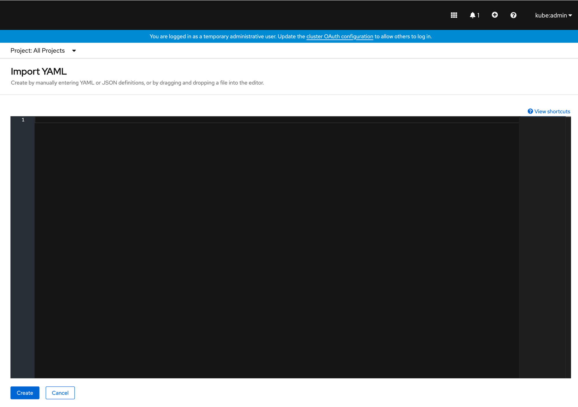 The plus icon bring up an editor where we can create an Openshift object definition.