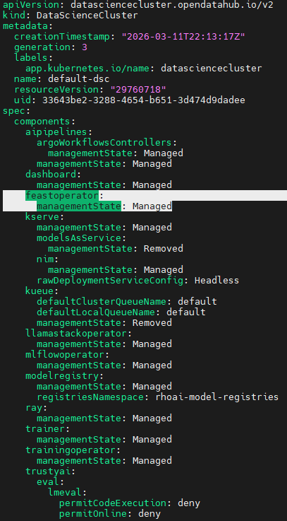 - Edit the datasciencecluster object and ensure feastoperator is set to "Managed" as shown below.
