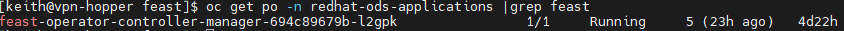 - To verify that the operator got enabled, go to "redhat-ods-applications" namespace/project and check for existence and runningstate of feast-operator-controller.