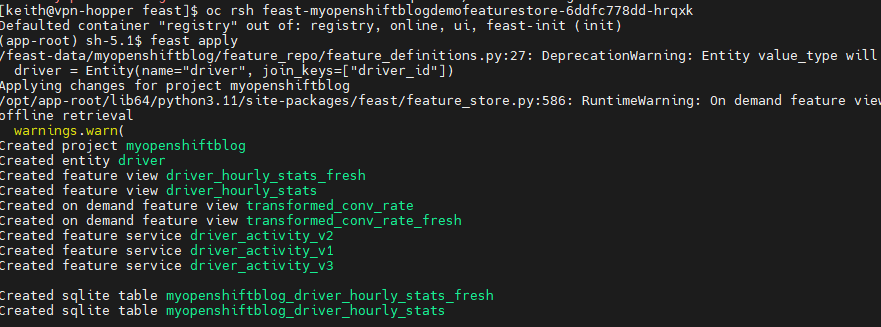 oc rsh feast-myopenshiftblogdemofeaturestore-6ddfc778dd-hrqxkRun "feast apply" on the terminal