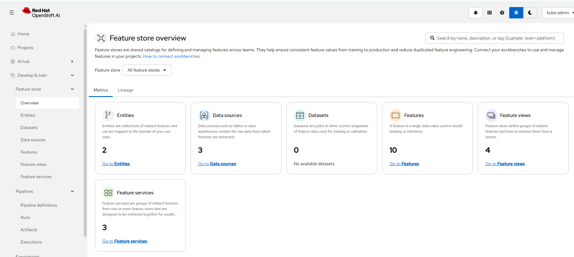 While Red Hat OpenShift AI manages the background services via the FeatureStore object, data scientists and developers primarily interact with the store using the Feast CLI. This command-line interface allows you to manage the logical components defined in your code and verify that the data flow is healthy.